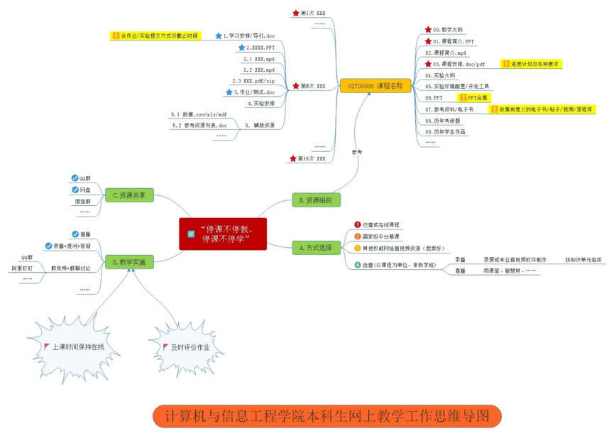 2020年春季学期延期开学期间本科生网上教学工作实施方案,提供组织保障,明确工作内容。同时,为了更直观地理解如何开展网上教学工作,学院制定思维导图,从教学方式选择、教学内容组织、教学资源共享、教学实施方式等方面进行解读,供全体教师参考。
