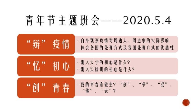 为了让同学们关心时事与实事,激发爱国热情与提高学习积极性,本次班会设定3个主题:“辩”疫情,让同学们结合周边情况观察疫情对他们的影响,并思考目前情况下各个国家的疫情防控方式及自己的感悟;“忆”初心:让同学们回忆刚进入大学校园的梦想以及加入明德计划实验班时的梦想,要时刻不忘初心,努力进取;“创”青春,让每位同学思考青春该如何度过,切不可遇到困难就退缩,要戒骄戒躁,努力拼搏,创造美好。