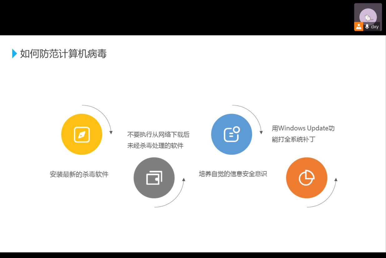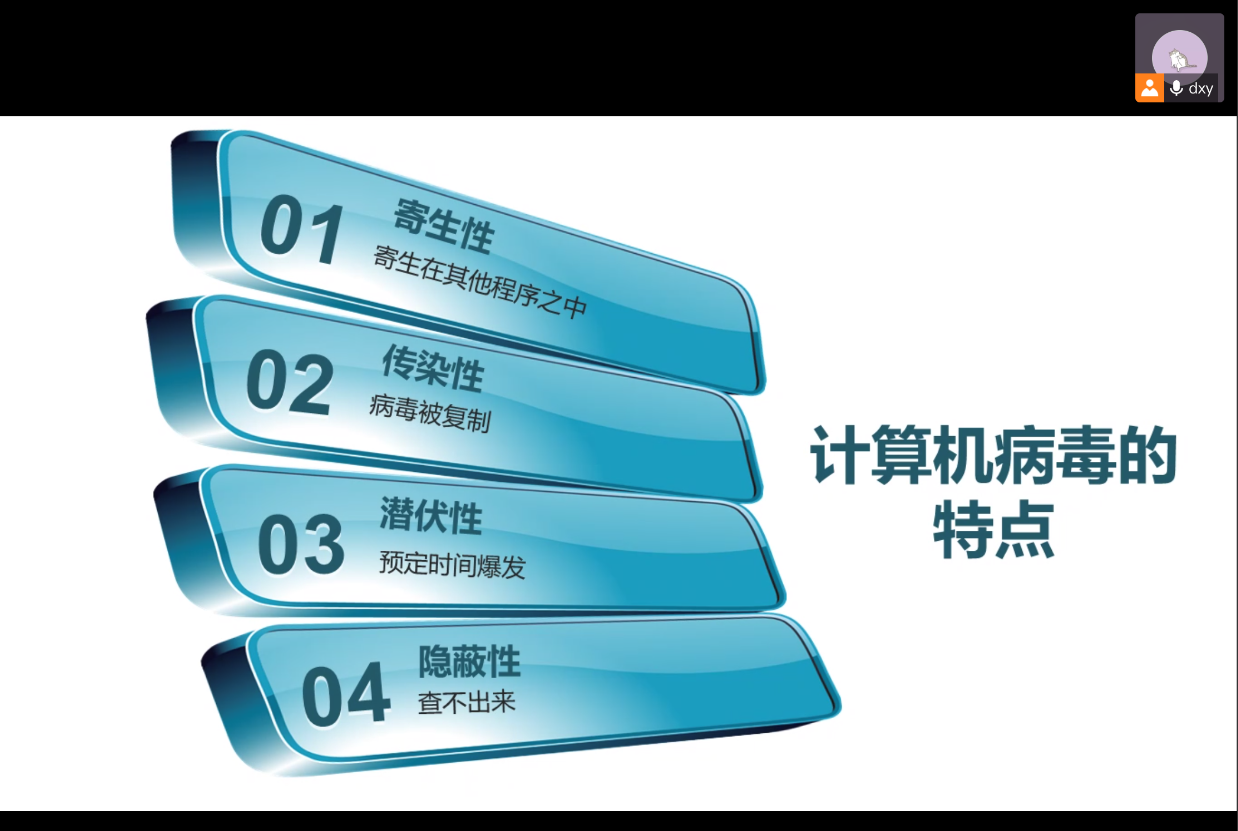 杜晓玉老师为大家讲解计算机病毒的相关知识并向大家列举出如何防范病毒的方法