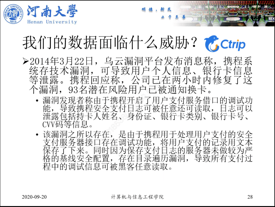 马宇翔老师从携程漏洞引发的事件入手向大家讲解信息安全的概念以及其中产生的法律问题