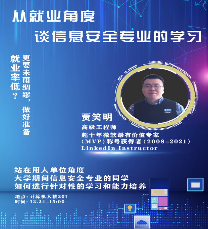 信息化管理办公室信息部主任贾笑明同志为大家作科普报告,报告围绕从就业角度谈信息安全专业的学习这一主题展开。