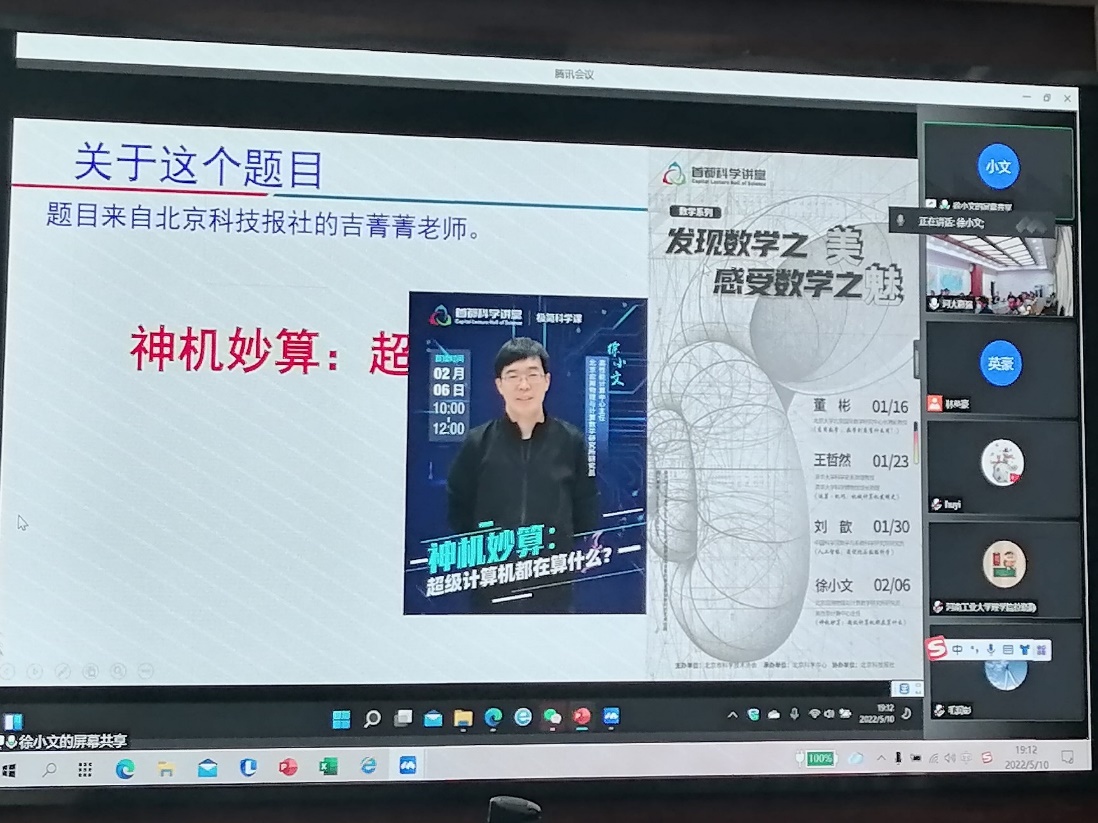 师生作了主题为《神机妙算:超级计算机都在算什么?》的报告。本次讲座采用线上线下结合的方式进行,校内师生在河南省大数据分析与处理重点实验室104会议室参会,报告会由学院副院长左宪禹主持。